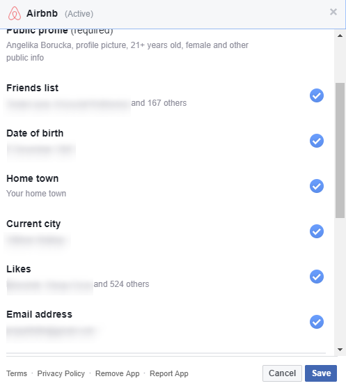 Zobaczcie przy okazji, jak wiele danych wymaga konto na Airbnb, a ile, dla porównania, sklep internetowy. Biorąc pod uwagę, że nie mam zamiaru korzystać z ich usług w najbliższym czasie, usunę autoryzację aplikacji. Zawsze będę mogła wrócić – zezwalając jej ponownie na dostęp.