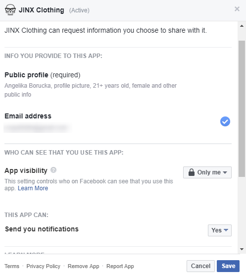 Na tej stronie znajdziecie autoryzowane aplikacje. Będą tu gry i te wszystkie strony, na których do logowania używasz właśnie Facebooka. (PS. Wiecie, że to bezpieczniejsza forma logowania niż po prostu mail+hasło?). W łatwy i przejrzysty sposób możecie tutaj wyrzucić autoryzowane już aplikacje oraz zobaczyć, do jakich informacji i opcji mają one dostęp.